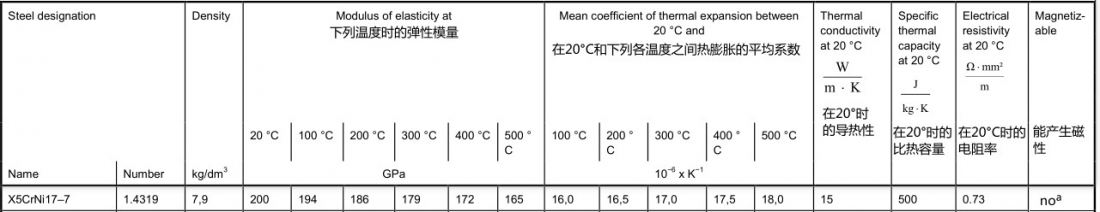 物理性能(參考DIN EN 10088-1-2014)下表中的a備注:由冷變形造成的少量鐵素體和/或馬氏體會增加磁化能力