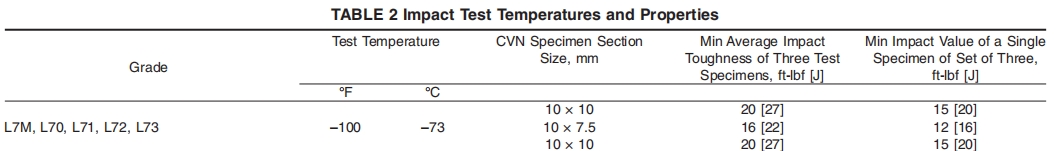 | 說明 | 沖擊要求 對于在-325°F(-200°C)以上溫度使用的1級、1A和2級奧氏體鋼;在-425°F(-255°C)以上溫度使用的1級和1A奧氏體等級B8、B8A、B8P、B8C、B8CA、B8LN和B8LNA的材料;以及直徑小于或等于1/2英寸(12.5mm)的所有鐵素體或奧氏體鋼螺栓材料可以不要求進行沖擊試驗,除非補充要求S1在采購訂單中指明要求。(此說明摘自原件6.2.1.1) |