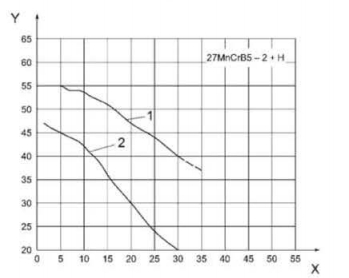圖中:X-離開淬火端距離/mm;Y-硬度HRC;1-硬度上限;2-硬度下限