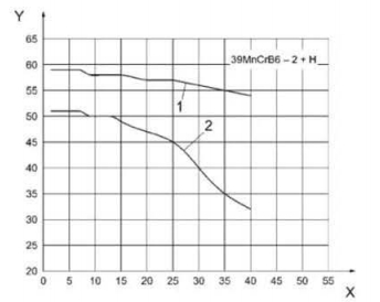 圖中:X-離開淬火端距離/mm;Y-硬度HRC;1-硬度上限;2-硬度下限