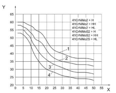 圖中:X-離開淬火端距離/mm;Y-硬度HRC;1-硬度上限;2-HL等級的硬度上限;3-HH等級的硬度下限;4-硬度下限