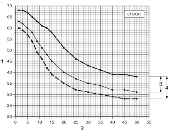 淬透性帶范圍(H/HH)、離開淬火端的距離/mm、硬度HRC的關(guān)系圖圖中:1-硬度HRC;2-離開淬火端的距離/mm;3-HH等級;4-H等級