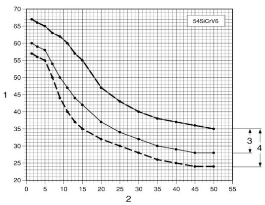 淬透性帶范圍(H/HH)、離開淬火端的距離/mm、硬度HRC的關(guān)系圖圖中:1-硬度HRC;2-離開淬火端的距離/mm;3-HH等級(jí);4-H等級(jí)