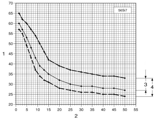 淬透性帶范圍(H/HH)、離開淬火端的距離/mm、硬度HRC的關(guān)系圖圖中:1-硬度HRC;2-離開淬火端的距離/mm;3-HH等級;4-H等級