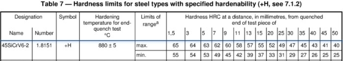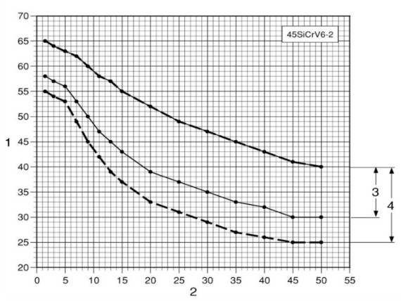 淬透性帶范圍(H/HH)、離開淬火端的距離/mm、硬度HRC的關(guān)系圖圖中:1-硬度HRC;2-離開淬火端的距離/mm;3-HH等級;4-H等級