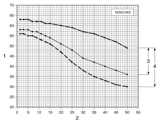 淬透性帶范圍(H/HH)、離開淬火端的距離/mm、硬度HRC的關(guān)系圖圖中:1-硬度HRC;2-離開淬火端的距離/mm;3-HH等級(jí);4-H等級(jí)
