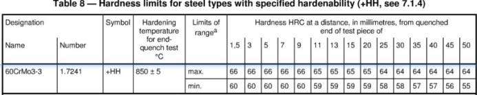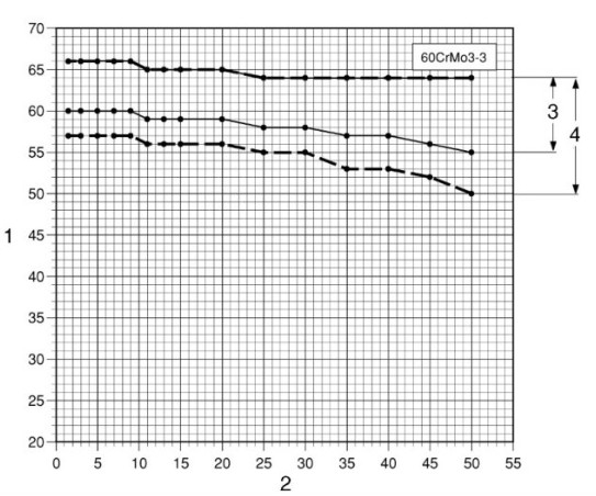 淬透性帶范圍(H/HH)、離開淬火端的距離/mm、硬度HRC的關(guān)系圖圖中:1-硬度HRC;2-離開淬火端的距離/mm;3-HH等級;4-H等級