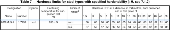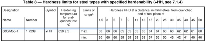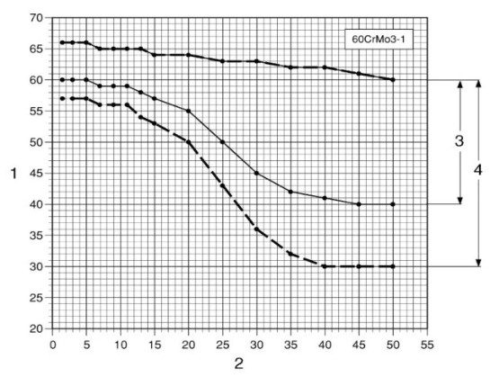 淬透性帶范圍(H/HH)、離開淬火端的距離/mm、硬度HRC的關系圖圖中:1-硬度HRC;2-離開淬火端的距離/mm;3-HH等級;4-H等級