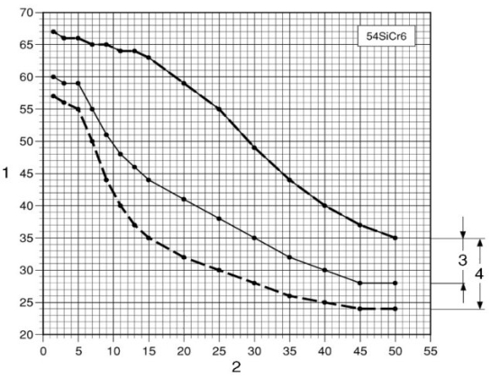 淬透性帶范圍(H/HH)、離開淬火端的距離/mm、硬度HRC的關(guān)系圖圖中:1-硬度HRC;2-離開淬火端的距離/mm;3-HH等級;4-H等級